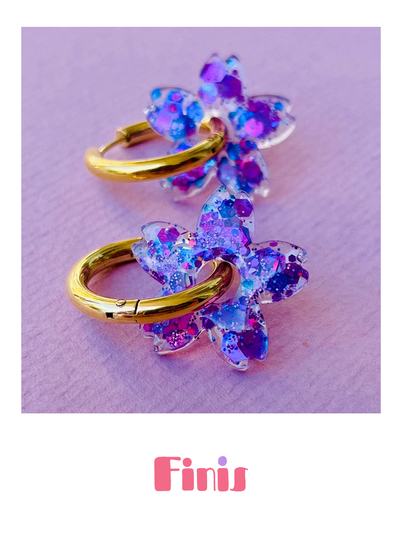 Blumenförmige Kunstharz-Ohrringe mit schimmerndem Glitzer – handgefertigt und kombiniert mit vergoldeten Edelstahl-Creolen. Jedes Paar ein kleines Unikat voller Freude.