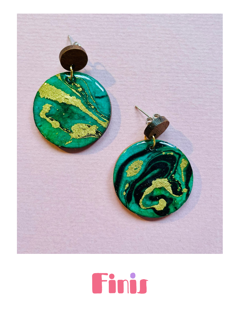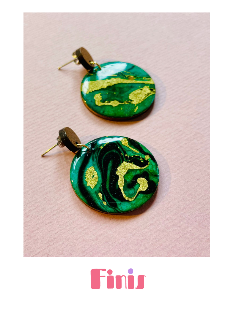 Die handgemachten Ohrringe bestehen aus dem ganz besonderen gold-grünen in Nepal handgeschöpften Lokta-Papier. Versiegelt mit glänzendem Kunstharz entsteht ein einzigartiger 3D-Effekt – als würden die Farben im Licht tanzen. Ein Statement-Piece für alle, die das Besondere lieben.